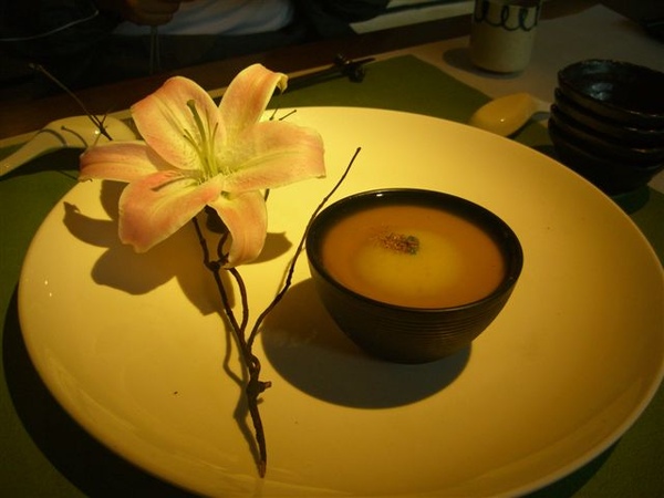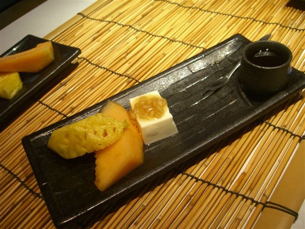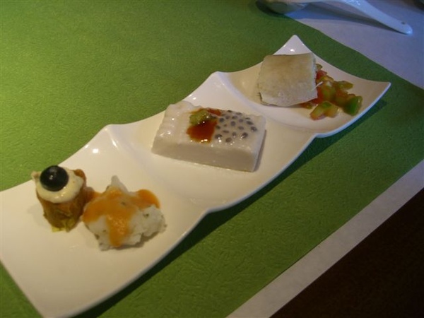 三道冷盤前菜有煙燻鮭魚、醬油山粉圓佐木棉豆腐、榴槤捲,三道的風味各異,我還蠻喜歡煙燻鮭魚的處理方式,放在上面的好像是黑橄欖味道還蠻特別的,另外兩道我們都覺得還好