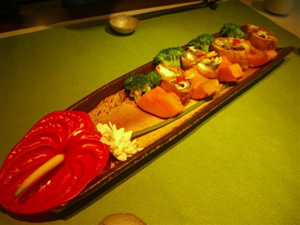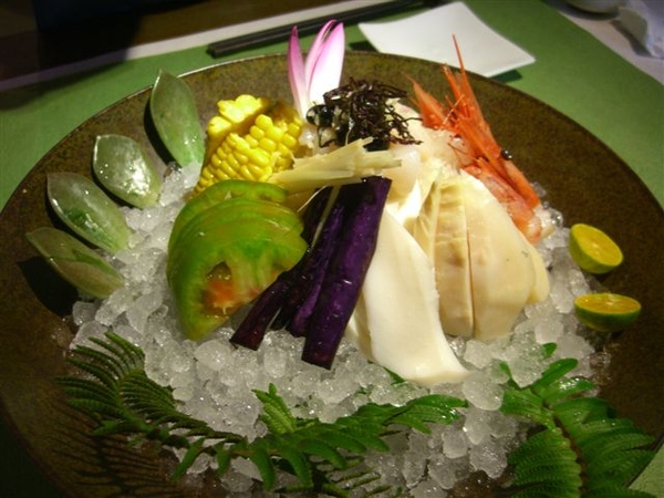 生魚片拼盤跟新鮮蔬菜,拍到的這面都是茄子、玉米、嫩筍、石蓮花、紫菜等,另一面有鮭魚、海鱺、花枝、生干貝還有魚皮,生食部分還蠻新鮮的,下面又有用碎冰盛著保持鮮度,蔬菜吃得到自然的甜味,這道大家的評價都還蠻好的。
