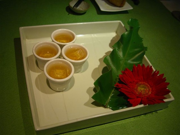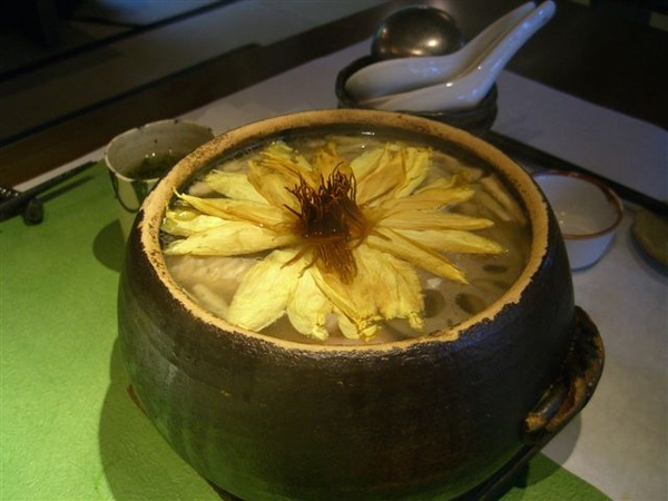 最後是招牌蓮花雞湯,這湯視覺效果十足,上面的花原本是一個花苞,加了熱湯才綻開,配上整體的顏色真的相當賞心悅目,如果是請外國朋友看到這道大概會讚嘆連連;單就雞湯的滋味,其實我覺得還好耶,裡面是還有加上蓮子等等去熬可是雞味不濃,蓮子好像還是跟排骨煮好吃些....。