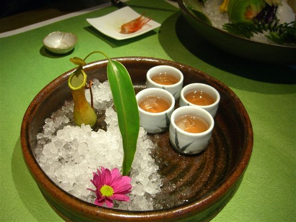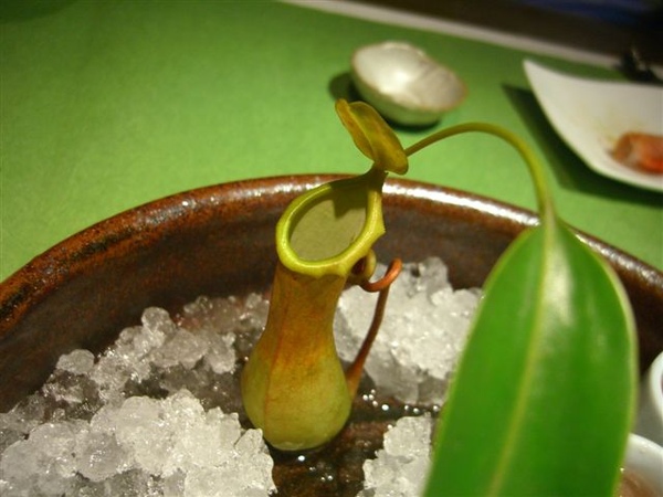而且這盤旁邊放的是豬籠草!我從小到大第一次看到豬籠草耶~以前都只在自然課本上看過,真的有一個孔,也真的有一個蓋子,還有大大的肚子耶:p超有趣的,一定得放上一張大特寫。