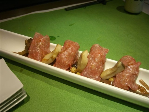 這道上面是義式火腿裡面包油飯,旁邊的是杏鮑菇;這個海狸先生就喜歡了,不過他是本來就愛吃油飯,的確他的義式火腿搭上油飯味道不但不會不搭,反而更濃郁了,不過還真少,一兩口就吃光了。