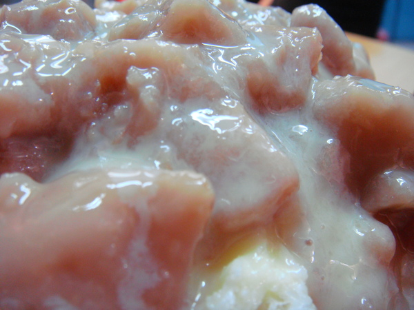 雖然冰的顆粒明顯比建中黑糖冰來的粗,不過配上煉乳香濃滋味還是很搭,更別提這招牌芋頭鬆軟卻又帶著彈性的奇妙口感,不是只有鬆還有特殊Q度源自店家精心挑選而且是自家栽種的芋頭品種,加上獨到的工夫讓這間芋頭大王的蜜芋頭遠近馳名,不膩的甜度適度的襯出芋頭特有的香氣及味道,加上濃濃的煉乳真是好吃,苦茶之家的蜜芋頭雖然也很有名可是加上冰之後的好吃度確實還是這間大勝阿。