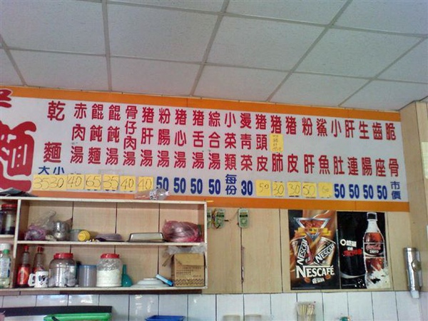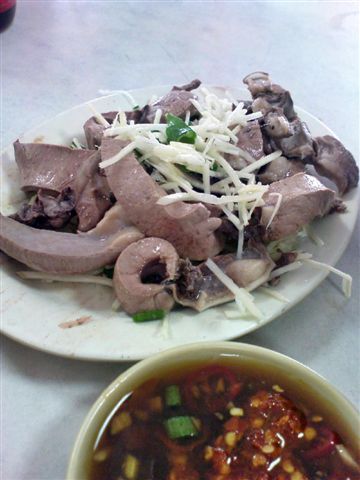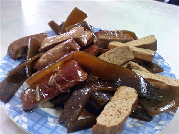 當天用餐去的晚很多東西都賣光了,想要吃的骨邊肉跟赤肉都沒了,所以小菜就點了豬心跟海帶豆乾;豬心切得很厚,嚼起來口感扎實新鮮,一份(NT.50)份量也不少,讓人吃起來很有大塊吃肉的豪邁感。