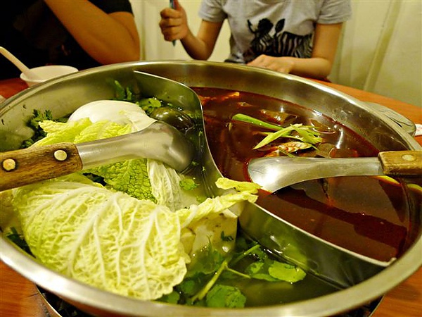 鍋底一份是$400,單點麻辣鍋跟點鴛鴦鍋價格是一樣的,不過超過4人食用的話,每個人還要再加收NT.70的鍋底費用,我們這次點麻辣鍋加清湯鍋,清湯鍋就是皮蛋、白菜跟香菜,味道簡單,適合拿來煮蔬菜,但不算特別有特色的鍋底,也許下次應該是看看牛奶鍋。