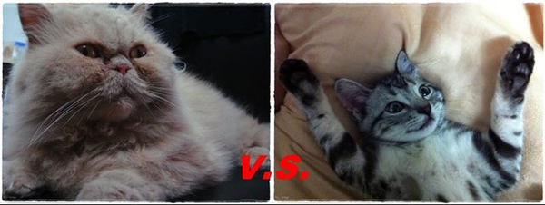 目前布魯斯每天不定時的會放出房間玩耍,冏咪的態度多是你不犯我我不犯你,偏偏布魯斯很愛找冏咪玩,這下惹惱了很想假裝布魯斯不存在的冏咪,導致家裡每天都會上演冏咪貓掌怒打白目仔布魯斯的戲碼,不過布魯斯也不是省油的燈,仗著年輕力壯跑給冏咪追,等沒事了又去弄冏咪...真的是超白目的,不過越玩感情越好,看來兩隻貓咪抱在一起睡的日子指日可待啦。