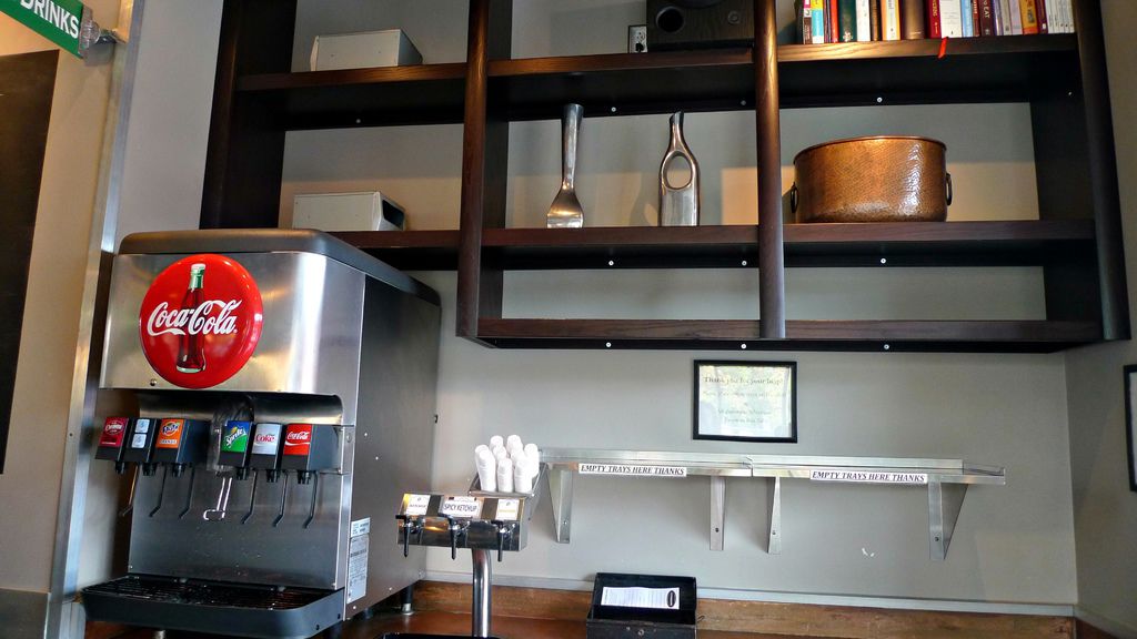 這邊餐點都是現點現做,在櫃檯點好後廚房會直接製作,作好後會叫名字送到你的位置,但是飲料是自助式的,點好後給杯子自己去裝,大部分在Chapel Hill吃到的漢堡店都是這樣