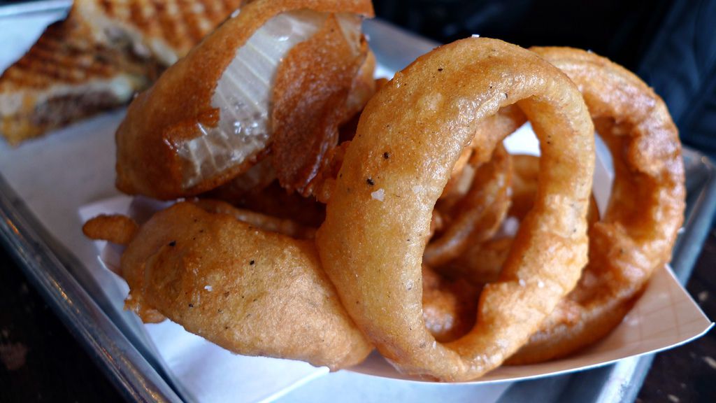 加點的附餐炸洋蔥圈$3/份,這份洋蔥圈又脆又香又很大份,吃了有稍稍填補台灣遊子想念鹽酥雞的思鄉胃,不過因為是炸物,一定要趁熱吃才好吃唷! 之前點的炸薯條也是比較脆的口感,一樣都是值得推薦的附餐。
