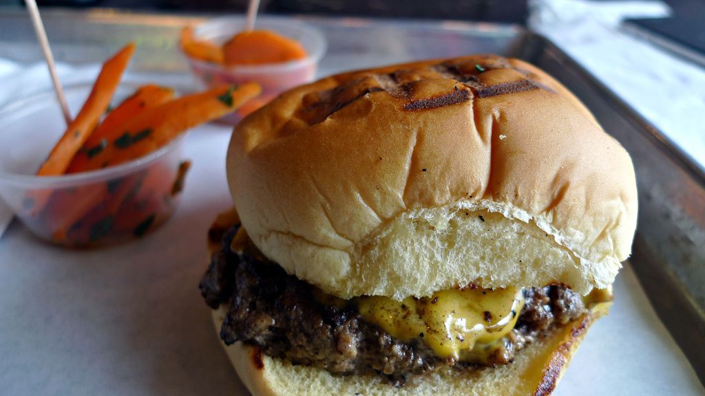 我最喜歡點的Plain Buger(chesebuger) singgle;$4.5,這是Sandwhich最基本款的漢堡,麵包加上漢堡肉,我選擇多加了一片起司,越單純越能感受到漢堡的原始美味,一咬下去肉汁汨汨流出,肉甜味充斥口中,加上起司的濃郁跟奶油的香氣,就是這樣簡單又直覺的美味讓人一口接一口停不下來,吃過其他款漢堡還是最喜歡這個原始版,不過這個漢堡的尺寸以美國一般看到的來說是偏小的,女生吃一個剛剛好,男生可以跟他說要加大版或是兩片肉的版本