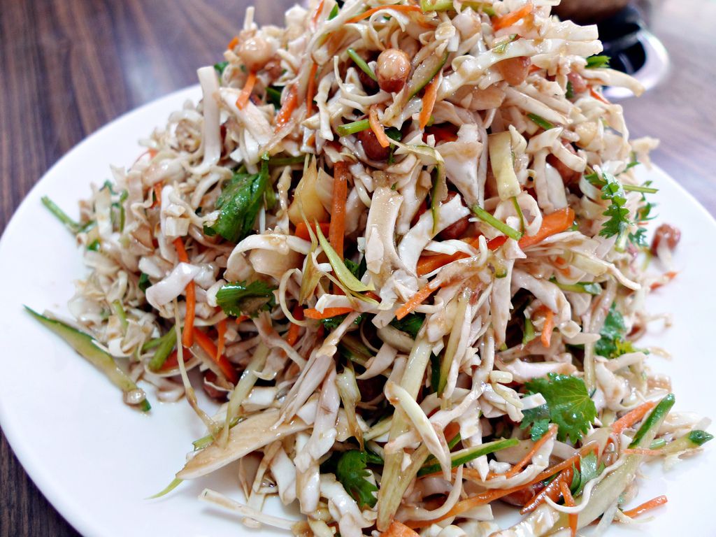 炸得吃多了有點膩,這時候配上幾口涼拌半天筍剛剛好,半天花其實就是檳榔花,拌上黃瓜絲、紅蘿蔔絲以酸甜調味,吃起來開胃又解膩