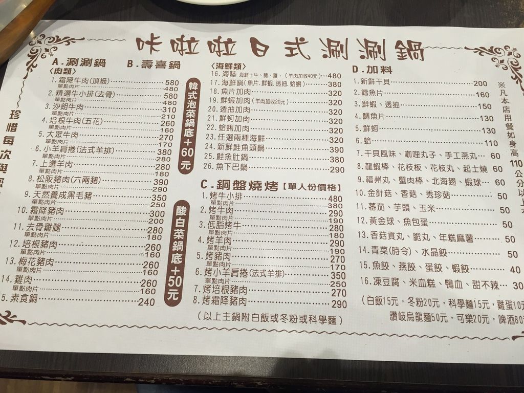 卡啦啦的價位並不昂貴,最低NT.260,最高NT.580,但是跟一般涮涮鍋店非常不一樣,每一樣東西都吃的到老闆的用心跟美味,量雖然看起來不多,但是吃完倒也覺得足夠,在用餐過程用店家也會跟客人說怎樣煮可以讓食材發揮到最美味,整間店充滿了老闆的個人風格,真的是讓人一試上癮,要不是離家實在太遠,每周都吃也不會膩阿